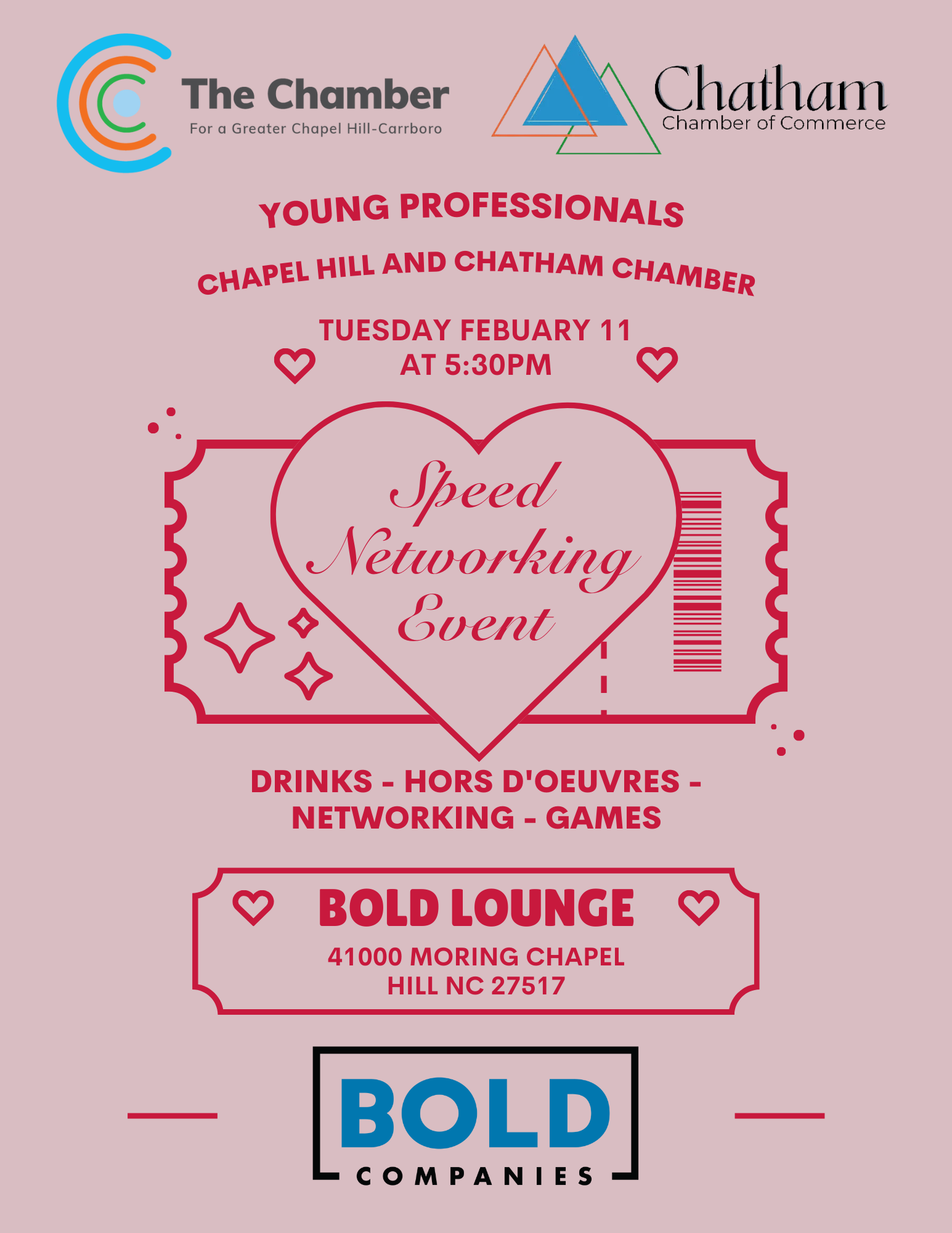 With Valentine's Day just around the corner, we're turning up the charm and teaming up with Chapel Hill Young Professional Group at their February Networking Social! Join the Young Professionals Group for an exciting Speed Networking Event—a fun and fast-paced way to make meaningful connections.