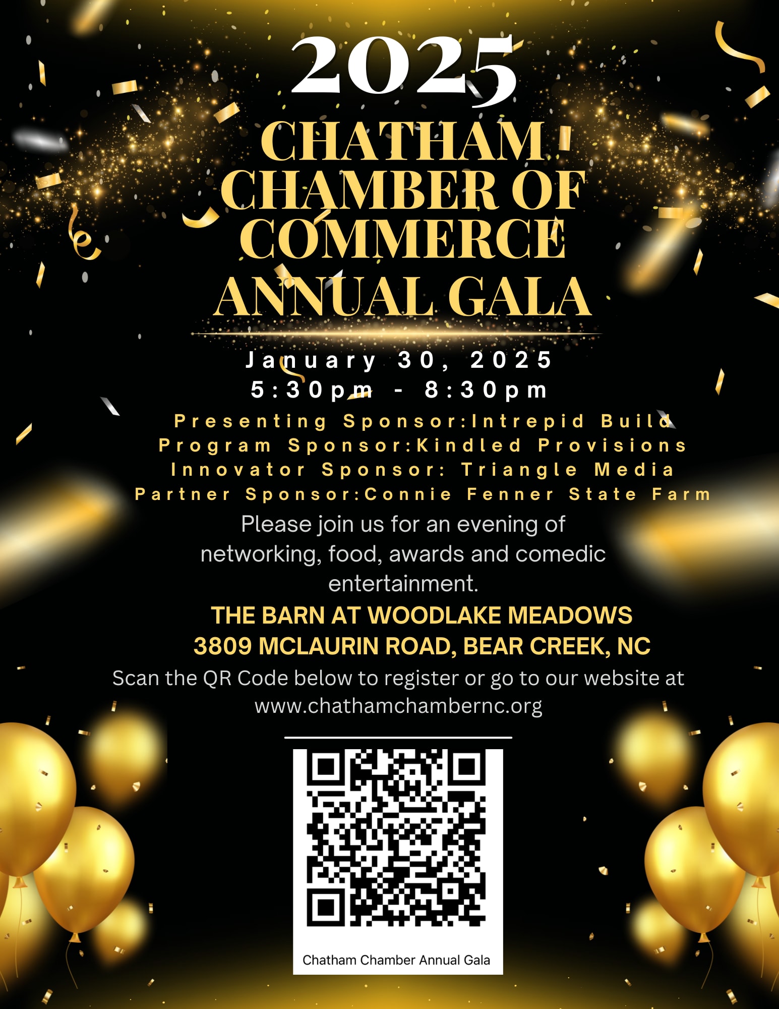 Join us for our 2025 Annual Gala on Thursday, January 30th, 2025 at The Barn at Woodlake Meadows. It's a time to come together to reflect on our achievements, discuss the future, present awards and celebrate the vibrant Chatham community. Tickets are $100.00.